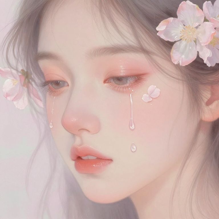 Emoi expressed as a delicate pastel painting, close-up of a serene face with tears turning into blooming flowers, soft brush strokes, gentle light, conveying a sense of bittersweet emotion and quiet introspection, ethereal background
