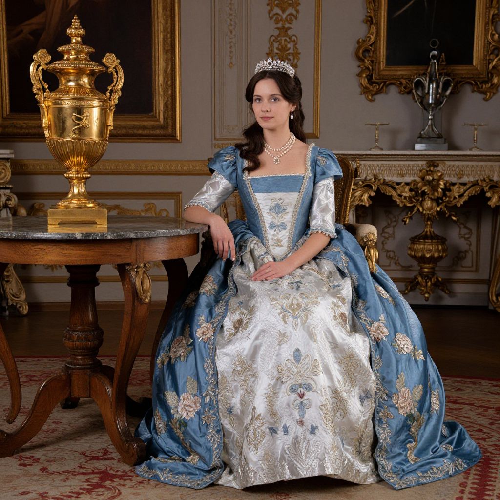 Photograph of a fair-skinned woman in an elaborate blue and silver baroque-style gown, adorned with gold embroidery, sitting in an opulent,