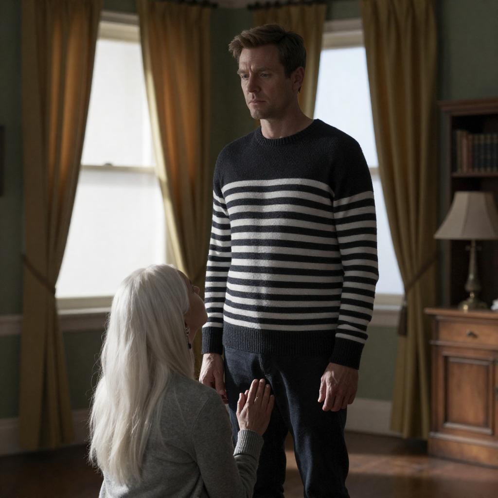 Photograph of a man and a woman standing in a dimly lit room. Man with short brown hair, wearing a black and white striped sweater, stands tall with a serious expression. Woman with long white hair, wearing a gray cardigan, looks up at him while holding his hands. Yellow curtains frame two windows in the background. Wooden cabinet and bookshelf with a lamp on the right. Light from the windows casts soft shadows.