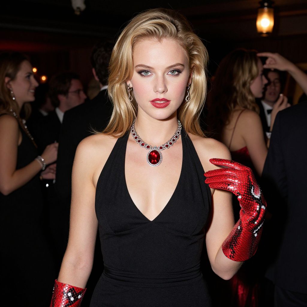 A blonde woman in her 20s, wearing a black halter dress, red opera gloves made of snake skin, and a red and silver necklace, stands in a swanky party setting, reminiscent of 90s fashion.