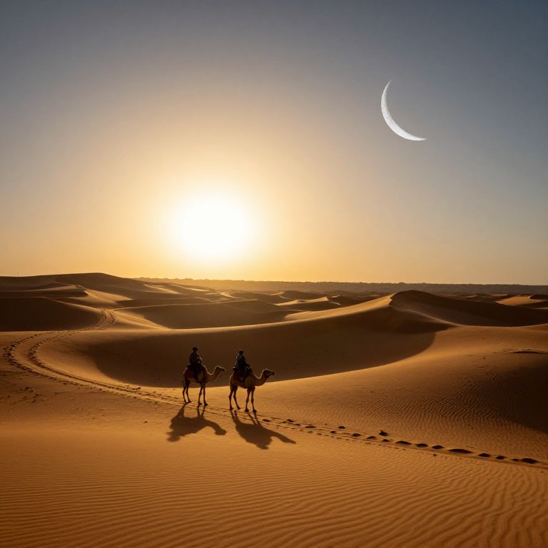 Photograph of a desert sunset with two silhouetted riders on camels in the foreground, leaving footprints in the rippled, golden-orange sand. The sun is low on the horizon, casting long shadows. A crescent moon is visible in the clear, gradient sky, transitioning from yellow near the sun to deep blue at the top. The desert landscape has rolling sand dunes, with the sun's light accentuating their contours. The overall scene conveys a serene, timeless atmosphere.