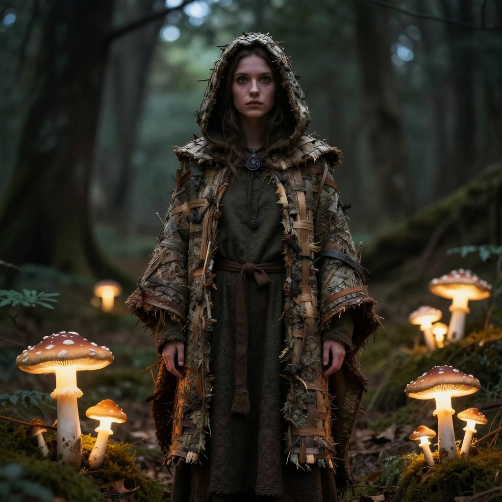 A young woman dressed as a forest druid wearing a hooded woven bark cloak with braided hair stands in a dimly lit forest surrounded by glowing mushrooms. The scene has a mystical and fantasy atmosphere with soft natural lighting highlighting the subject and fungi.