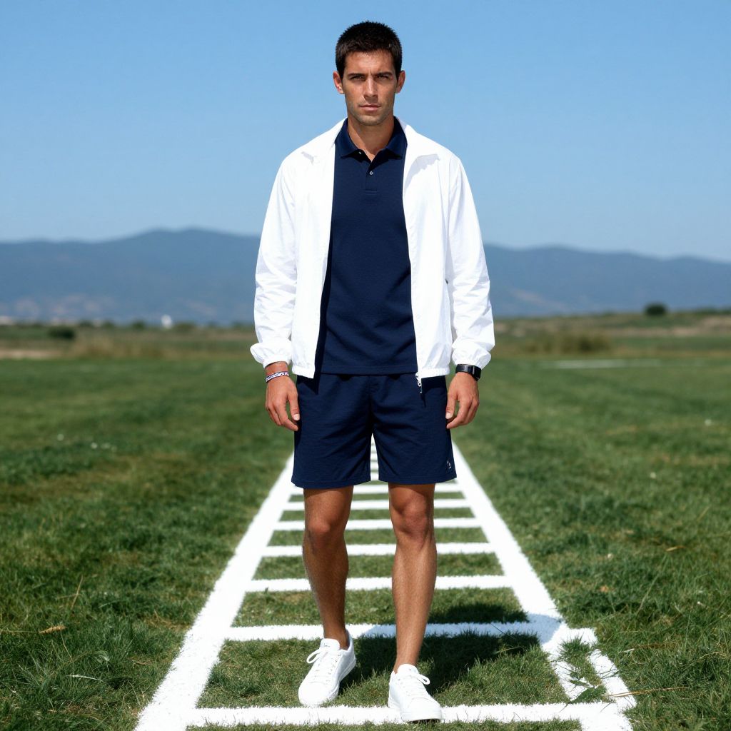 Photograph of a young man with short dark hair, wearing a white jacket, black polo, and shorts, standing on a white line path in a