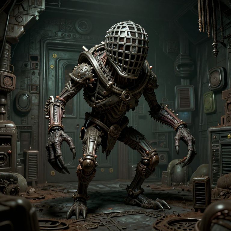 Digital artwork of a futuristic, robotic humanoid creature with a metallic, checkered helmet. The creature stands in a dimly lit, cluttered sci-fi room filled with various machinery, wires, and equipment. Its body is composed of dark, mechanical parts with glowing accents, and it has sharp, claw-like hands and feet. The background features dark blue and gray tones, with illuminated control panels and a large door in the back. The overall atmosphere is ominous and tech-heavy, with a high level of detail in the robot's design and the surrounding environment.