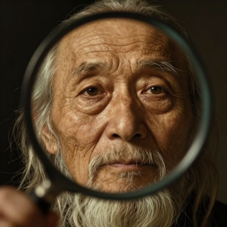 Channeling the spirit of classical painting, a photorealistic portrait emerges with soft golden light illuminating deep wrinkles and soulful eyes on an old sage's face. Viewed from an intimate low-angle perspective, each nuanced expression is unveiled on his weathered visage as if through a magnifying glass. This captivating image fuses timeless artistry with realism, evoking emotions ranging from reverence for age to profound introspection.