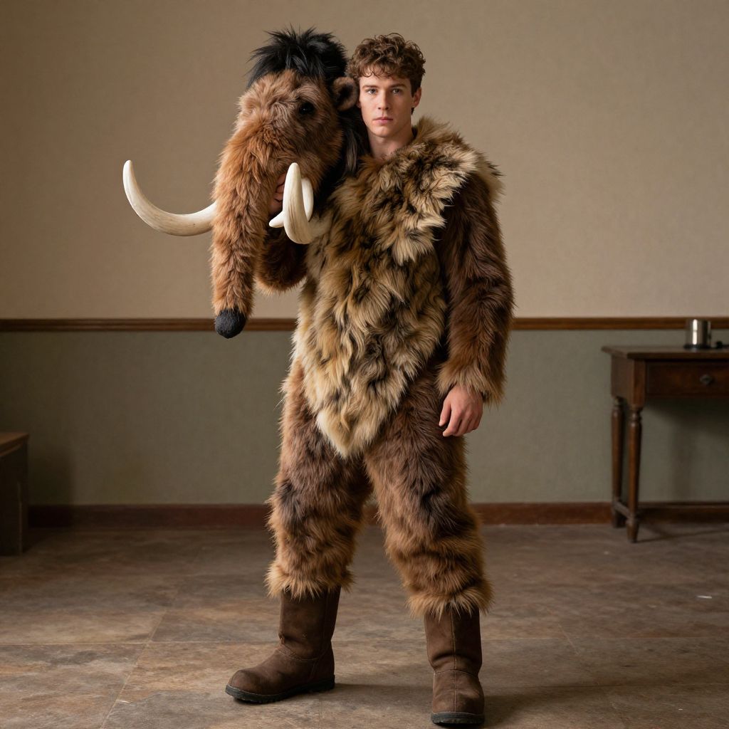 "woolly mammoth costume man, 1boy, male focus, solo, holding, standing, boots, pelt, indoors, old, full body Realistic photo of casual sexy person with pretty face"