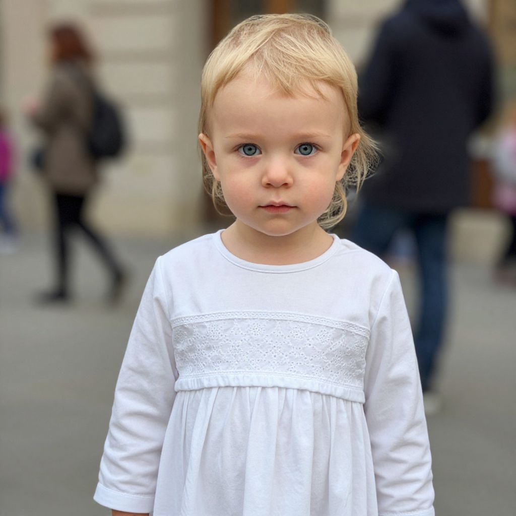 "infant christening outfit, solo, looking at viewer, 1girl, blue eyes, blonde hair, dress, blurry background, child, realistic, male focus, long sleeves, blurry, crossdressing Realistic photo of casual sexy person with pretty face"