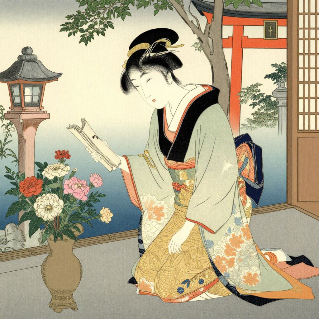 A delicate illustration in the traditional Japanese ukiyo-e style depicts a woman in a flowing kimono gracefully arranging flowers and reading a book on a serene garden patio, with a shrine visible in the background, capturing the tranquil beauty and cultural elegance reminiscent of Nobukazu's work.