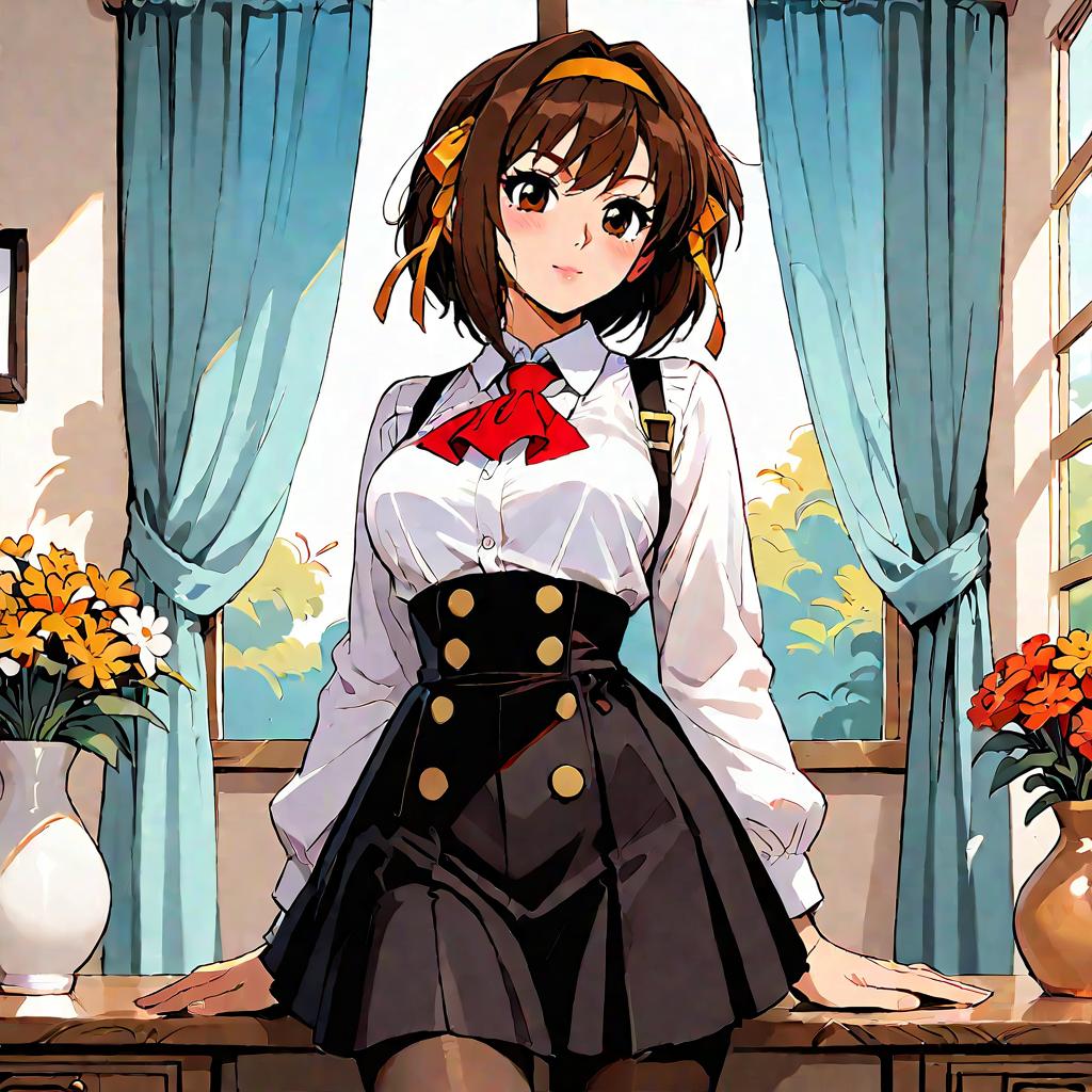 Score_9, score_8_up, source_anime suzumiya_haruhi, suzumiya_haruhi_no_yuuutsu, 1girl, brown_hair, brown_eyes, skirt, shirt, long sleeves, white shirt, pantyhose, frills, collared shirt, black skirt, black_pantyhose, ascot, high-waist_skirt, meme_attire, red ascot, centerfrills, solo, upper bodydetailed_background, outdoors, highres, indoors, split screen, window, curtains, standing, fully clothed