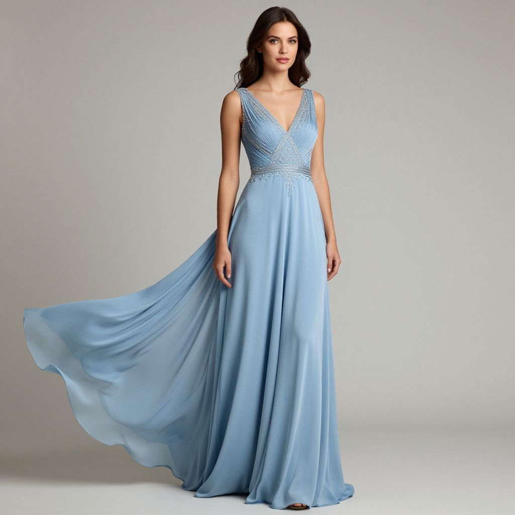 Elegant woman showcasing a flowing light blue satin gown adorned with intricate beadwork at the bodice, exuding sophistication against a neutral backdrop.
