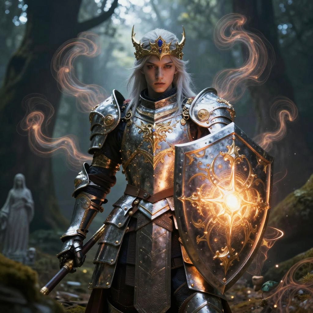 Paladin concept art illustrating a female paladin with ornate and heavy plate armor, adorned with religious insignias, bathed in divine light, casting a protective barrier in a mystical forest clearing, with detailed textures and vivid colors.