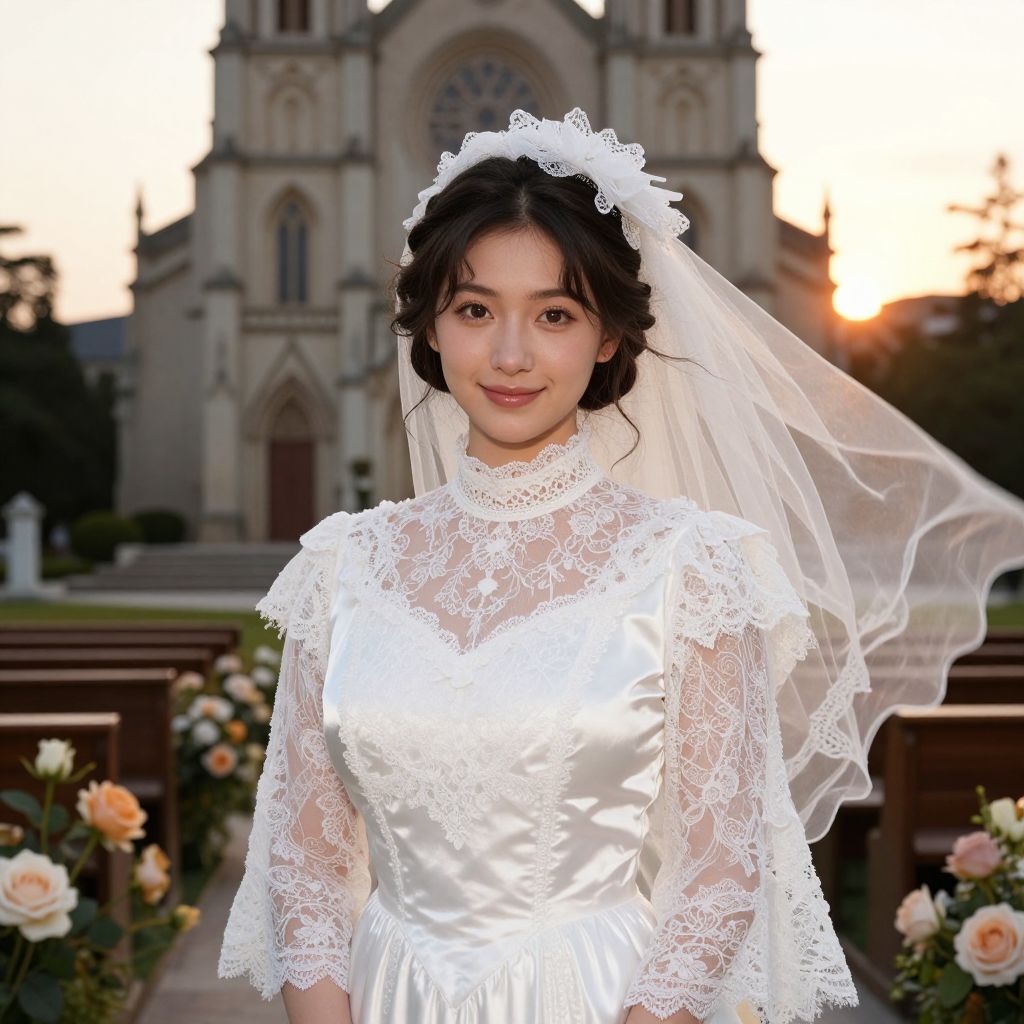 A beautiful classic wedding costume worn by a young woman with soft brown eyes, fair skin, and a delicate smile, standing in a grand 1920s-style church garden under a golden sunset, with ornate lace, a white satin dress, and a small lace veil flowing gently in the wind, surrounded by blooming roses and vintage floral arrangements.. The woman has big tits and cute face