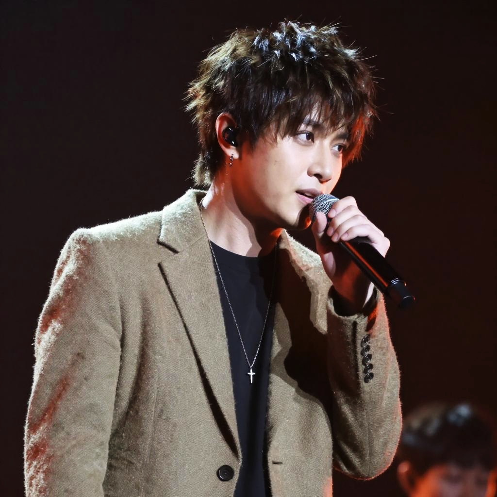 Photograph of a young Asian male singer with tousled black hair, wearing a beige blazer over a black shirt, holding a microphone, singing into