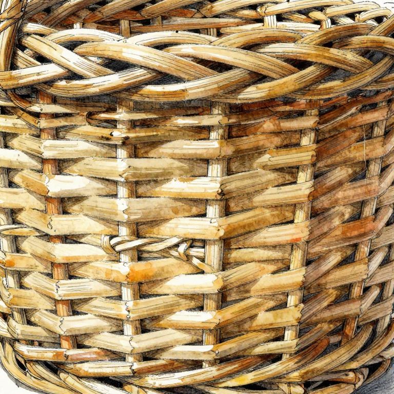 Basket texture drawing blending modern artistry with rustic charm, showing complex crisscross patterns and fiber twists in warm tones, rendered with watercolor and ink effects.