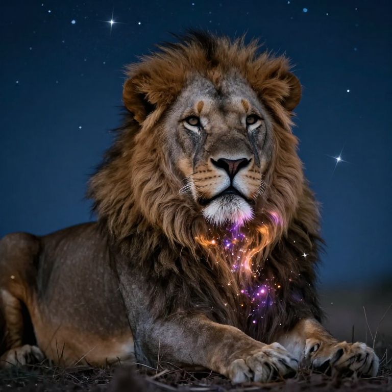 A majestic lion lies serenely beneath a starlit sky, its chest glowing with radiant stardust, as if its very breath weaves the cosmos into existence.