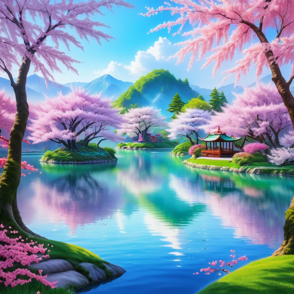 Fantasy painting of a serene lake surrounded by vibrant pink cherry blossom trees in full bloom. Traditional Asian-style pagoda buildings are situated on a small island in the lake, reflecting off the calm water. Snow-capped mountains are visible in the background under a bright blue sky. Lush green grass and stone pathways frame the scene, creating a peaceful and vivid landscape.