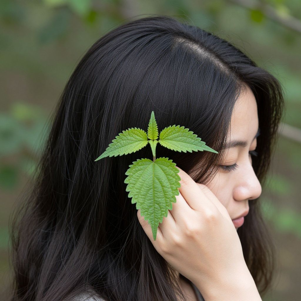 Woman holding a vibrant green nettle leaf near her hair, demonstrating its use for promoting hair growth against a blurred natural background.