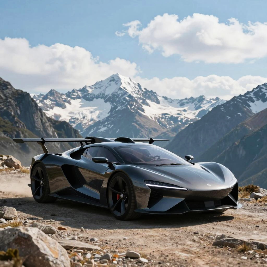 Photograph of a futuristic, black flying car hovering above a dense, green forest with misty mountains in the background. The car's design features sleek lines, a central dome-like structure, and transparent side panels. The sky is bright blue with scattered clouds, adding a contrast to the dark car and lush forest below. The image has a cinematic quality, emphasizing the car's aerodynamic and advanced look.