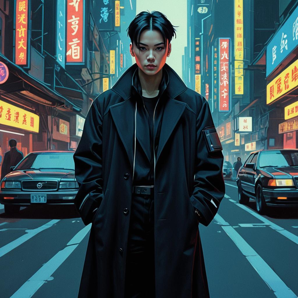 Portrait of a young Asian man dressed in a long black coat and black trousers standing confidently in a cyberpunk-style urban street. The background features neon signs with Asian characters, cars, and a futuristic cityscape with realistic shading and soft lighting, evoking a moody and edgy atmosphere.
