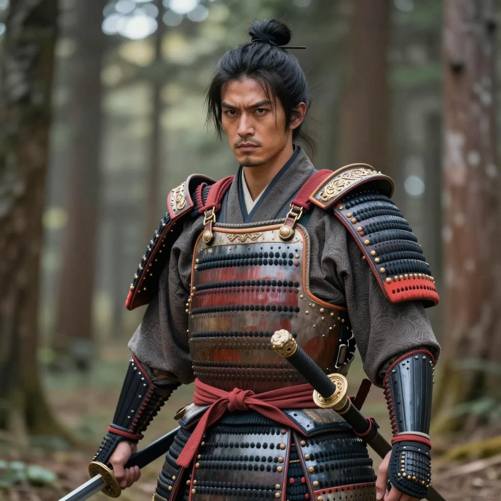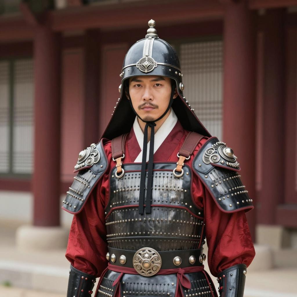 Ancient chinese warrior, photorealistic portrait of a young Asian man, traditional Korean samurai outfit, red silk robe, black leather armor, intricate silver helmet with ornate design, serious expression, mustache, dark hair tied back, standing in front of a traditional Korean building with red columns, natural light, soft focus background, realistic ures, detailed clothing, cultural attire, historical period, Asian ethnicity, traditional martial arts, realistic colors