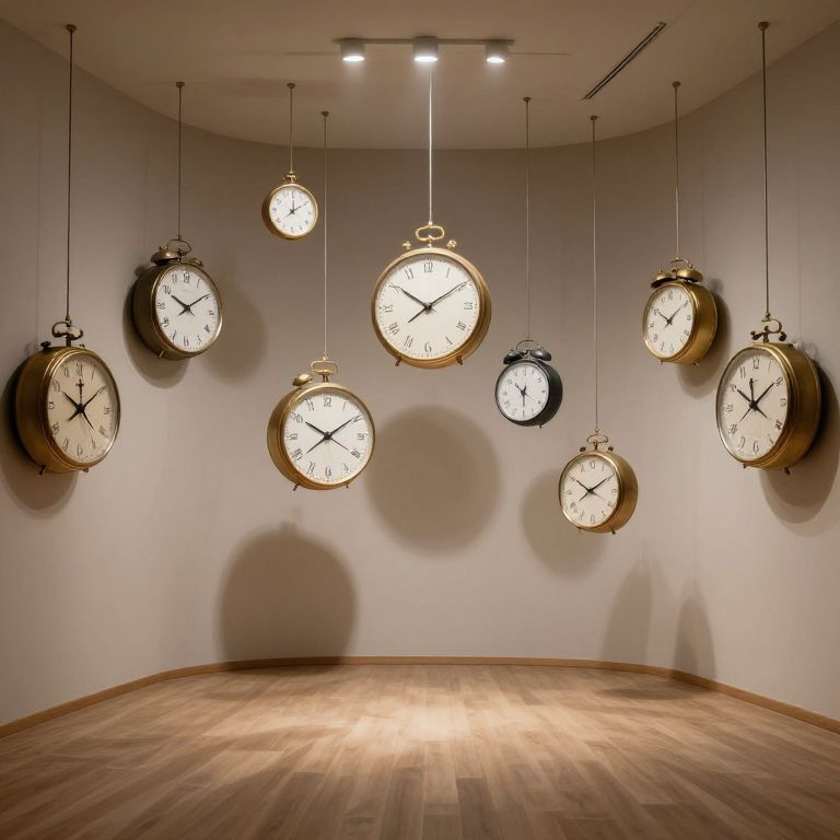 In a room where time defies gravity, a symphony of clocks whispers secrets of forgotten moments, their ticking a haunting melody of transience and memory, evoking both serenity and the weight of unspoken stories.