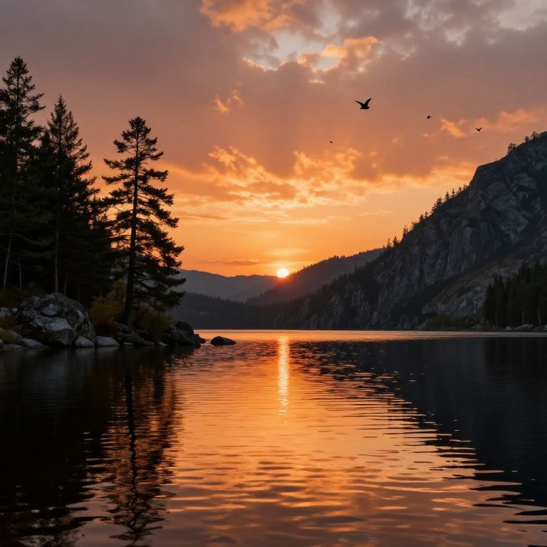 Natuurelementen captured in a peaceful lakeside at sunset, reflecting fiery orange skies and calm ripples, surrounded by tall pines and rocky cliffs, birds soaring above in a gentle breeze, the scene infused with warmth and serenity representing earth, water, air, and fire together.
