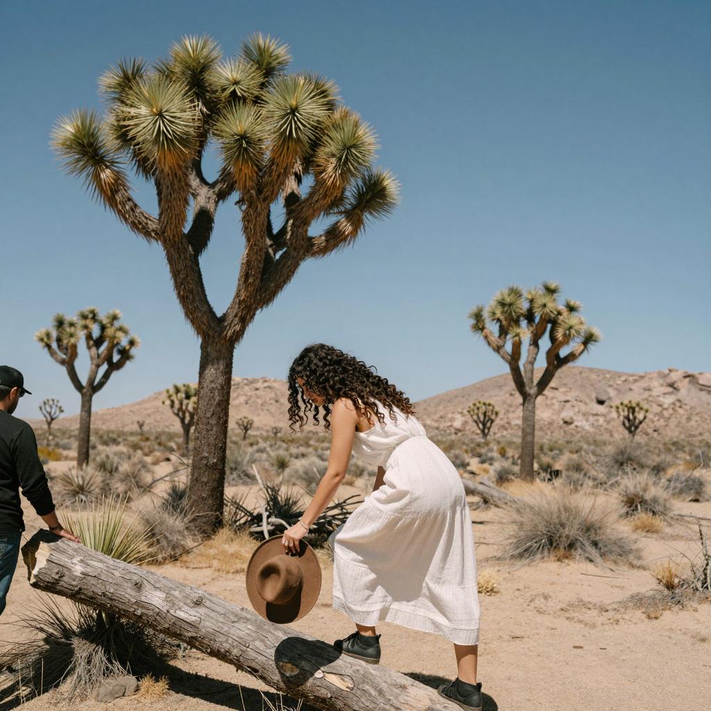 Young woman with long brown hair in a wide-brimmed beige hat, wearing a brown tie-dye sweatshirt, pink shorts, white socks, and gray hiking boots, standing on a rocky cliff. She has a black backpack on her back. Background: Grand Canyon with layered rock formations under a clear sky. Pine tree on the right. She is in profile, facing right, with a neutral expression. The sun casts shadows on the ground.