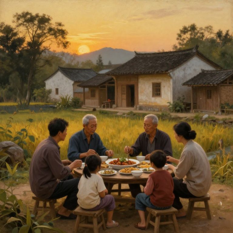 Filial piety illustrated in a peaceful rural village setting, a family sharing a meal together at dusk, warm golden hues, emotive atmosphere showing deep connection, realistic painting style with attention to cultural elements and nature surrounding them