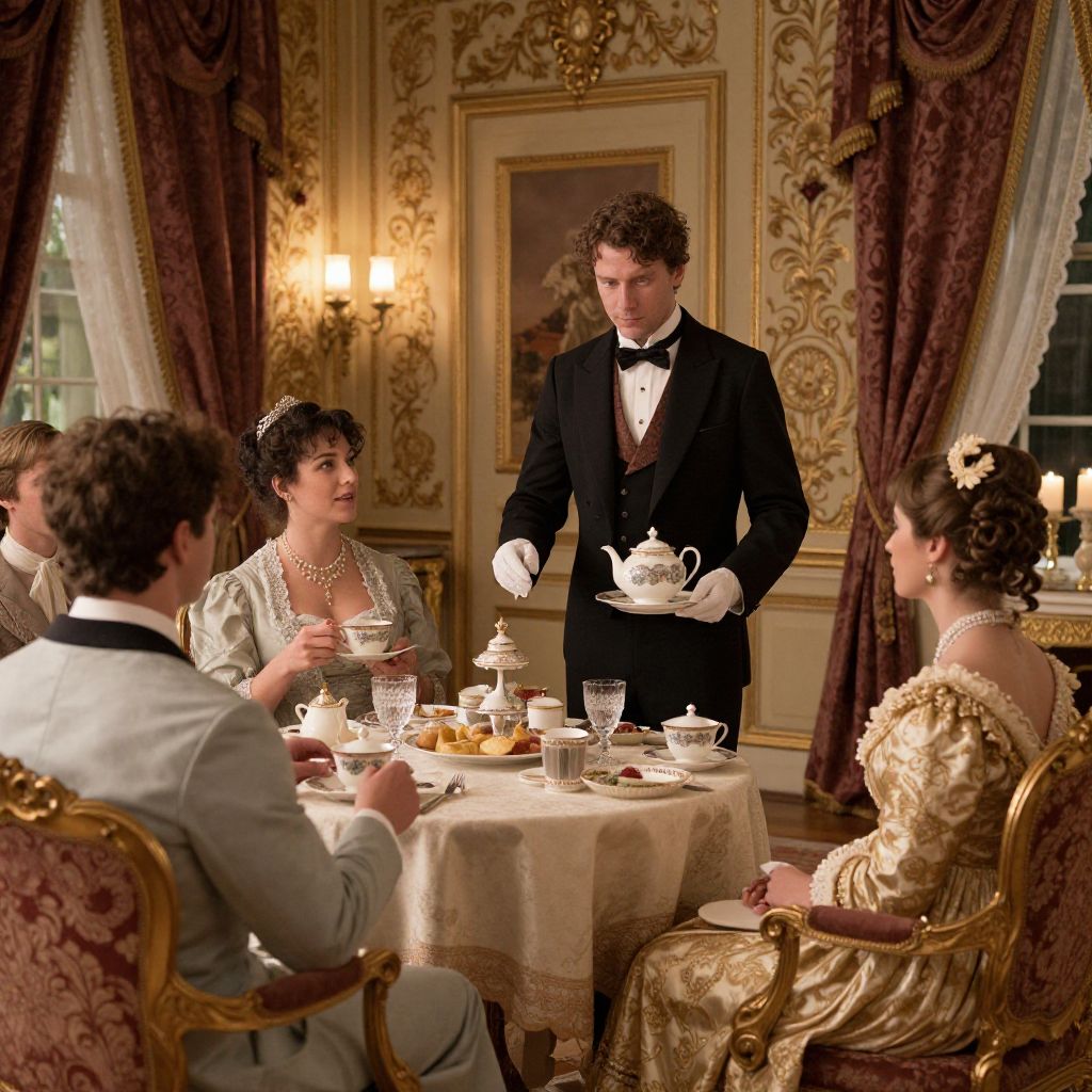 Dienen concept illustrated in an elegant Victorian setting, a loyal butler attentively serving tea to guests in a richly decorated drawing room, warm ambient lighting, intricate patterns, and lush furnishings emphasizing service and dedication.