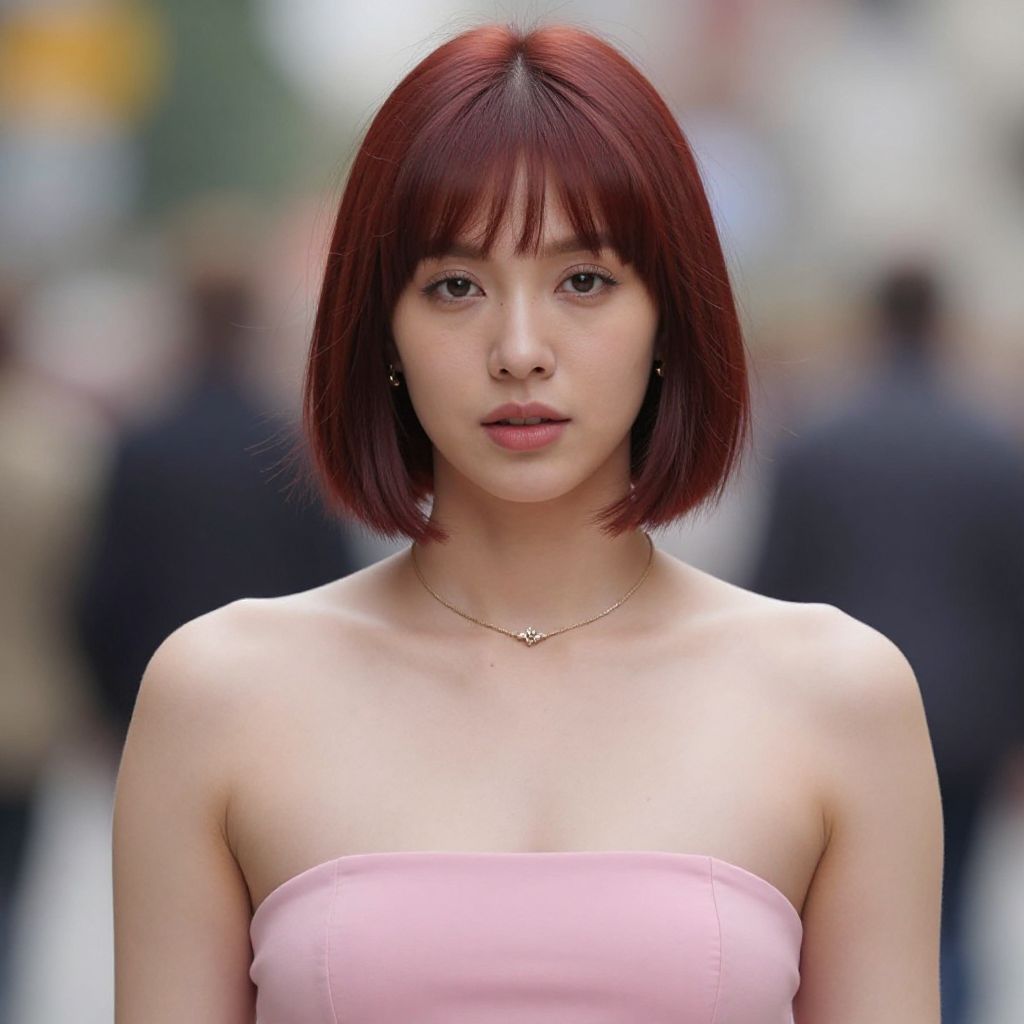 Photograph of an East Asian woman with straight, shoulder-length red hair, wearing a strapless pink dress, standing in a blurred urban background, with