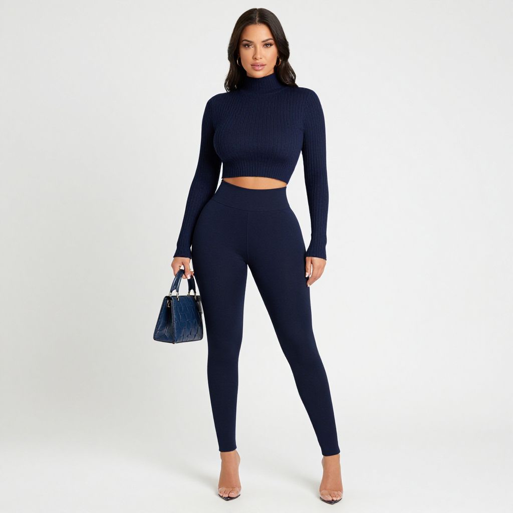 "Woman, contemporary, ribbed knit two-piece set in navy blue, cropped long-sleeve top with mock turtleneck, matching high-waisted leggings, clear pointed-toe high heels, accessorized with a small structured handbag in a matching blue shade with texture detail, long dark hair, white studio background.. Sexy. Pretty face and beаutiful eyes. Big breasts."