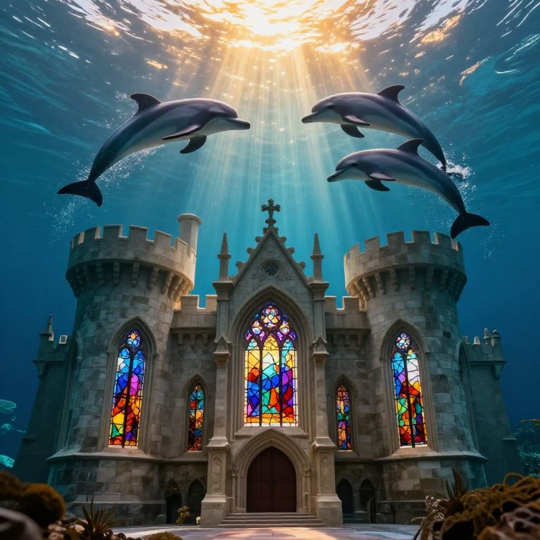 A dreamlike tableau showcases a tranquil medieval castle in the foreground, adorned with intricately designed stained glass windows that cast a kaleidoscope of colors on the ground below. The scene seamlessly transitions into an ethereal underwater realm in the background, where regal dolphins gracefully leap through shimmering waves bathed in golden sunlight filtering down from above. This captivating image evokes a sense of timelessness and wonder, inviting viewers to embark on a journey between reality and fantasy.