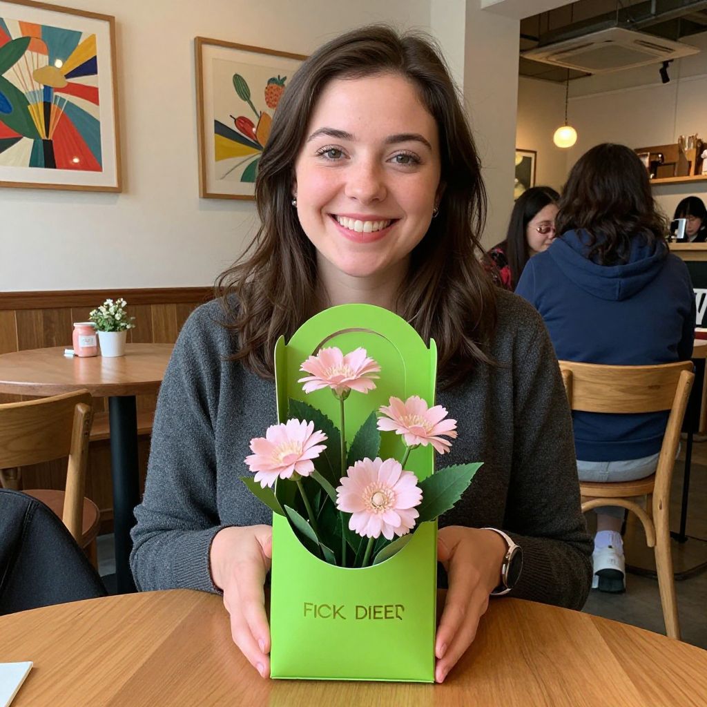 Photograph of a smiling woman with long, wavy dark brown hair, wearing a dark gray sweater, seated at a wooden table in a bright, modern café. She holds a green, rectangular paper vase with pink and white daisies, labeled "ICK DIER." The background shows two abstract, colorful paintings on white walls, wooden chairs, and a woman in a navy hoodie seated at another table. The café has warm lighting, with a small potted plant on the table to the left. The overall atmosphere is cozy and welcoming.