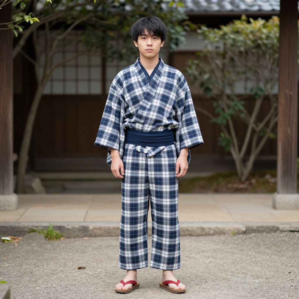 Photograph of an Asian man with black hair, wearing a black-and-white plaid yukata, black belt, and brown sandals, standing in