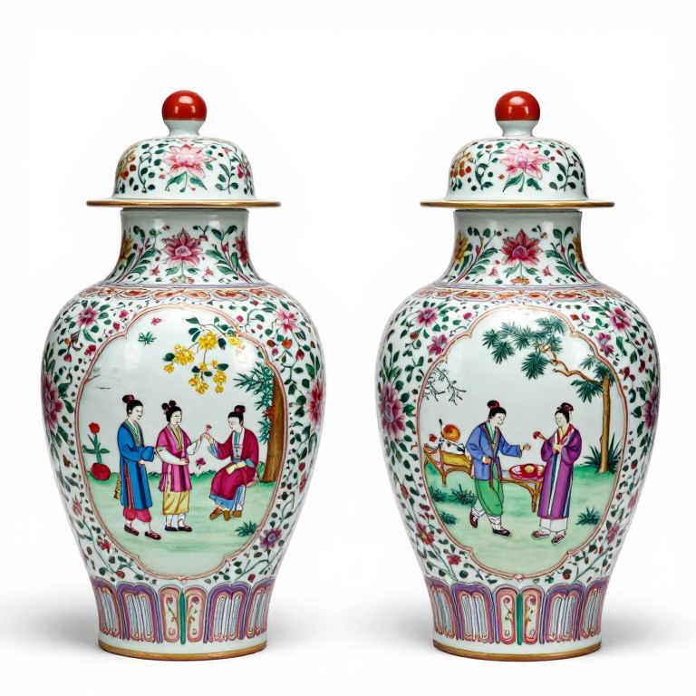 Two intricately decorated Chinese famille rose jars with matching lids stand side by side, featuring vibrant floral patterns and detailed scenes of figures in traditional attire, set against a white background.