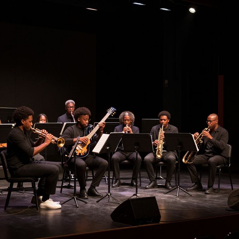 Photograph of a jazz quintet performing on a dimly lit stage. Seven African American male musicians, dressed in black, sit in a semi-circle with music stands. They play saxophones and a bass guitar, with one member playing an electric guitar. The musicians are focused, with some looking at their music, while others play with closed eyes. The stage has a dark, reflective floor and is illuminated by spotlights, casting sharp shadows. The background is black, emphasizing the performers. The overall mood is intimate and musical.