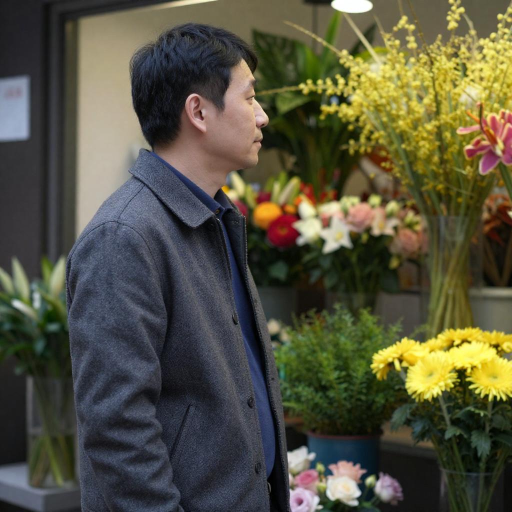 East Asian man with short black hair, wearing a gray herringbone jacket over a blue shirt, stands in front of a flower shop. He faces right, looking at vibrant flowers in glass display cases. Potted plants, colorful flowers, and yellow flowers are in the background. Man's profile visible.