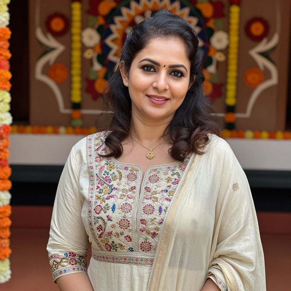 Photograph of a smiling Indian woman with dark, wavy hair, wearing a cream-colored traditional saree adorned with colorful floral embroidery on the chest and sleeves. She has a small gold bindi on her forehead and a gold necklace with a circular pendant. The background features a decorative wall with a colorful floral pattern and two vertical garlands, one orange and one yellow. The woman's complexion is medium, and she stands against a brown and white backdrop, exuding elegance and cultural pride.