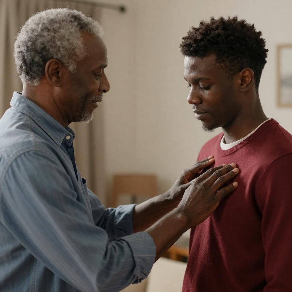 Photograph of two African-American men in a warmly lit room. The older man with gray hair, wearing a blue striped shirt, gently touches the younger man's chest. The younger man, with short curly hair, wears a red sweater over a white shirt. Background includes a blurred striped curtain and a wooden chair.