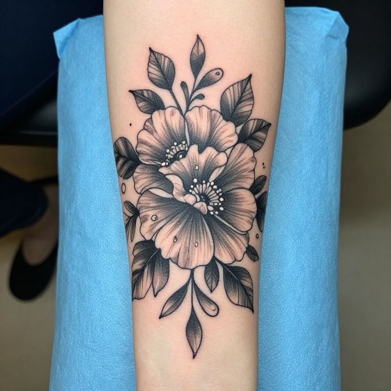 Black and gray floral tattoo on forearm, featuring a large flower with detailed petals and leaves, set against a blue towel background. Photographic image.
