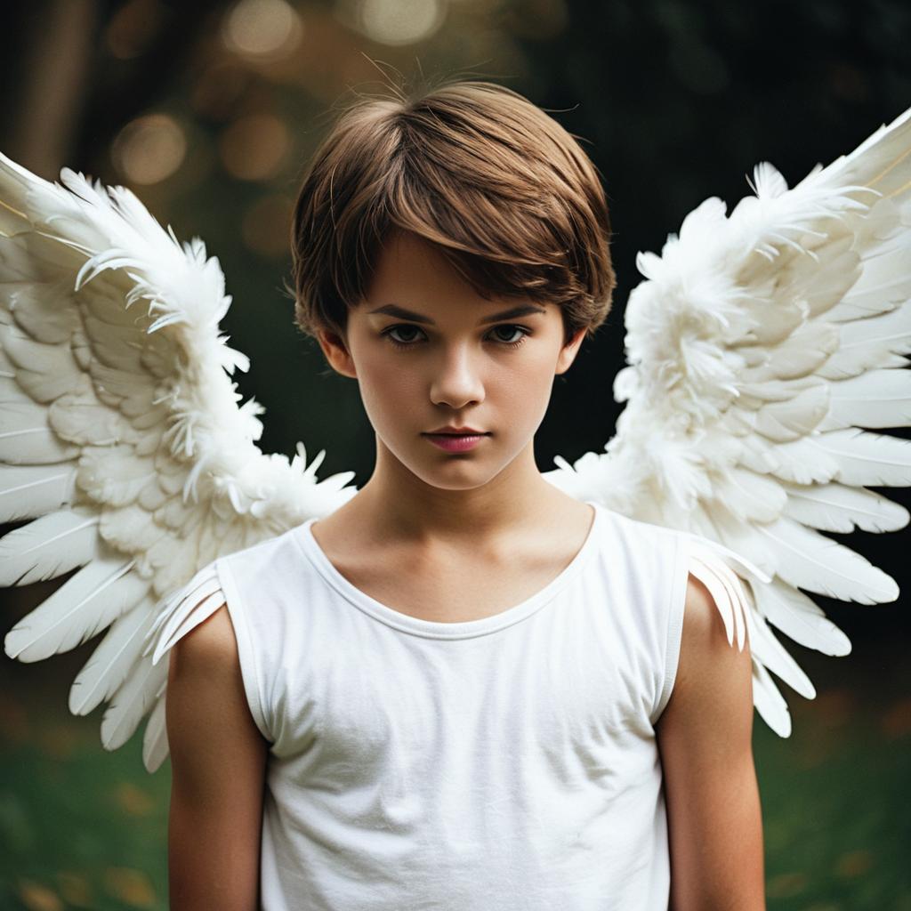 Portrait of a young boy with short brown hair wearing a white sleeveless shirt and realistic white feathered angel wings, representing the Angel Gabriel. The boy is looking directly at the camera with a serious expression, set against a softly blurred natural background.