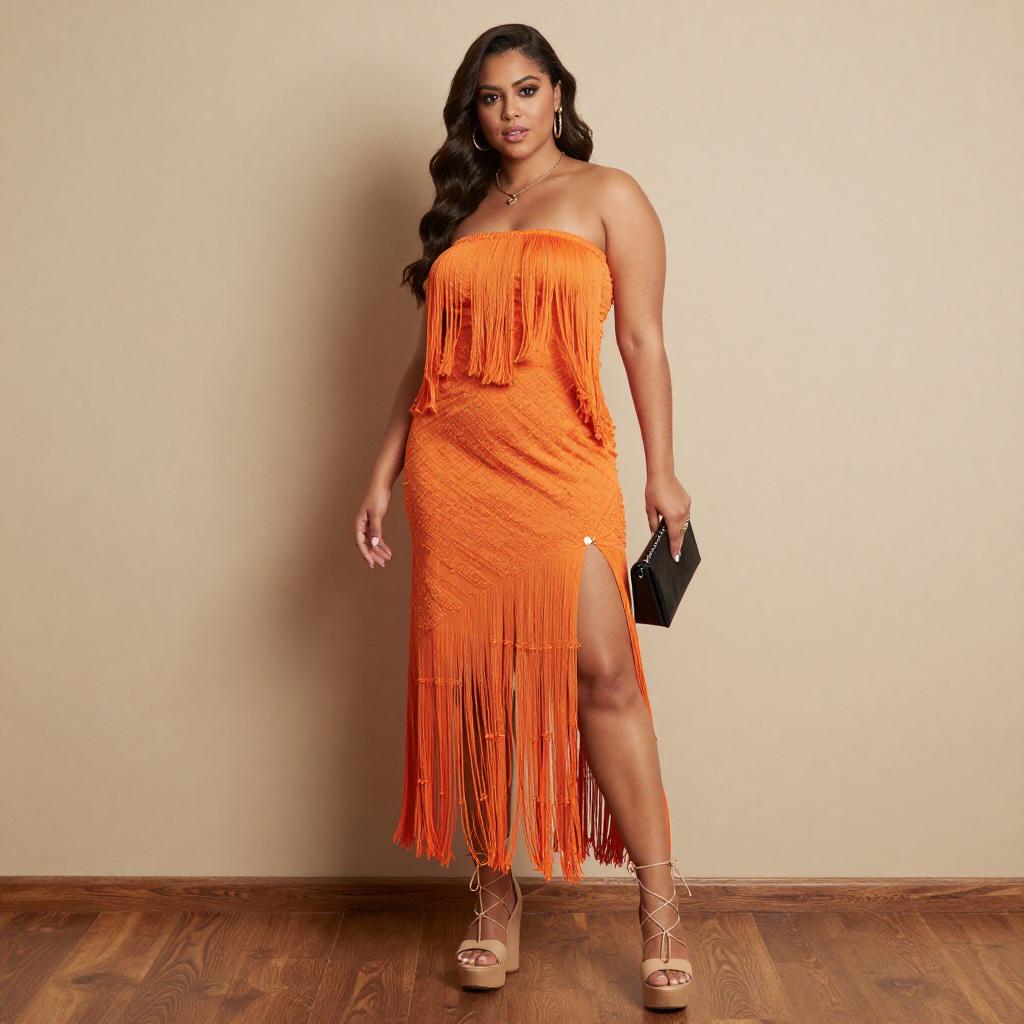Photograph of a curvy woman with long dark hair, wearing an orange, strapless, fringed dress with a high slit, revealing her legs. She holds a small black purse and wears beige, lace-up platform sandals. She stands against a beige wall in a room with wooden flooring, looking confidently at the camera.