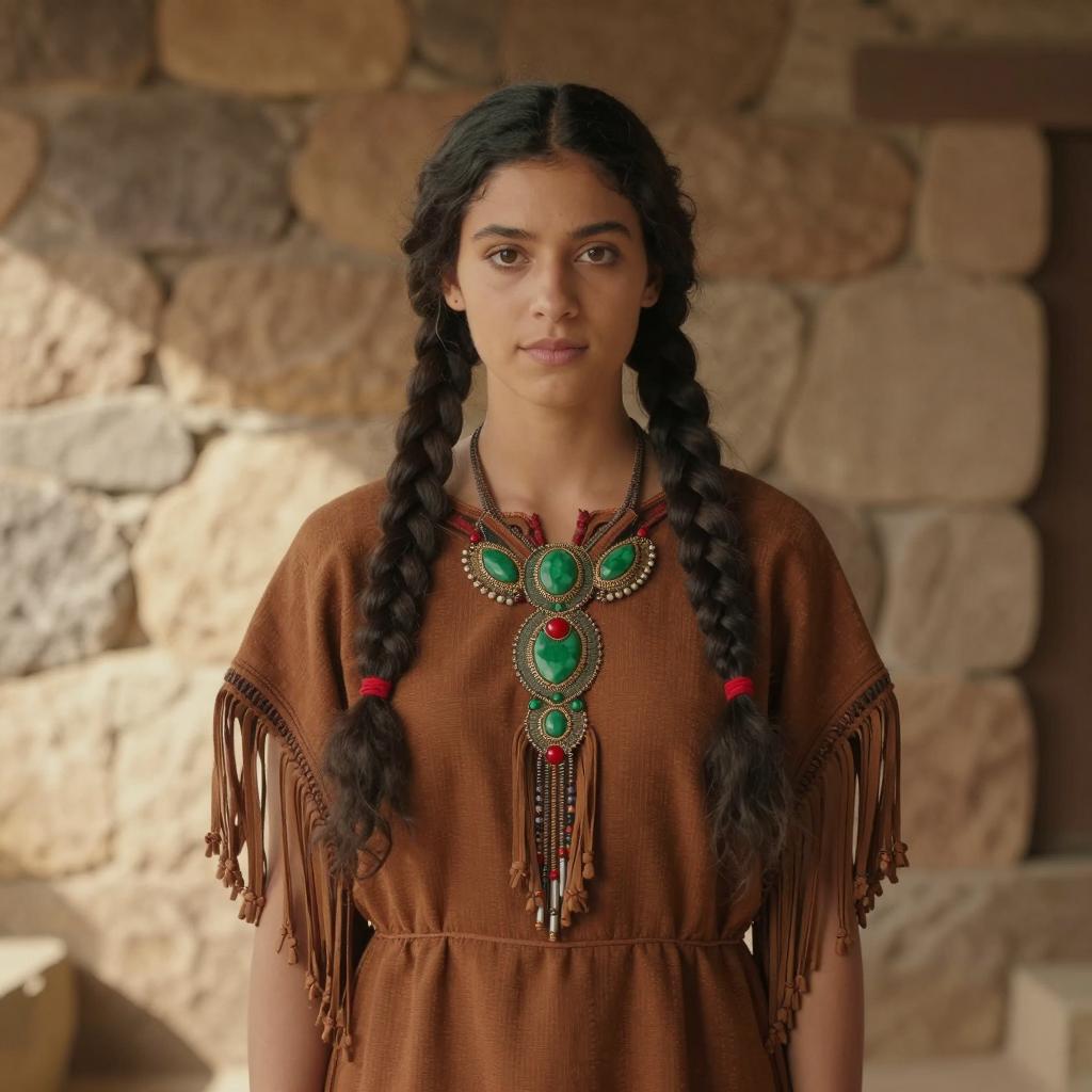 Portrait of a woman with medium brown skin and long wavy brown hair wearing a red and white striped headscarf and a white ancient-style tunic with gold trim. She has a serious expression and wears a delicate gold necklace. The background is a blurred stone wall with natural sunlight highlighting her features. The image captures a detailed and realistic representation of Macedonian traditional attire.