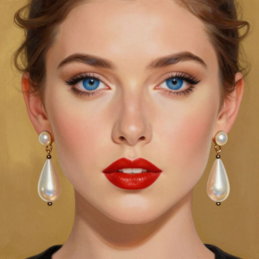 A vibrant digital portrait featuring a woman with striking blue eyes and bold red lips, adorned with elegant pearl earrings, set against a warm, golden background, showcasing a high-definition, painterly style reminiscent of Linda Vaughon's strong, empowering aesthetic.