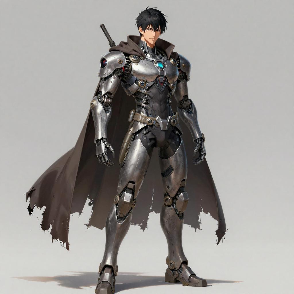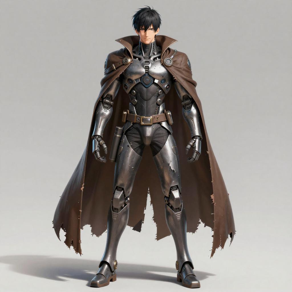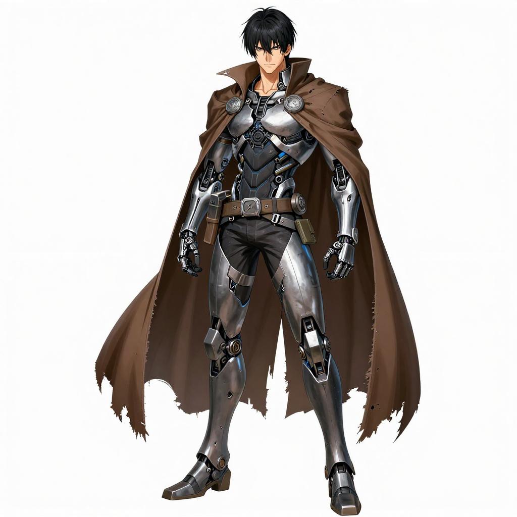 A detailed manga character portrait of a dark haired silver cyborg anime man wearing a tattered brown cape, trending on artstation, digital art, 4 k resolution, detailed, octane render, high quality, sharp focus, hq artwork, insane detail, concept art, character concept, character illustration, full body illustration, cinematic, dramatic lighting