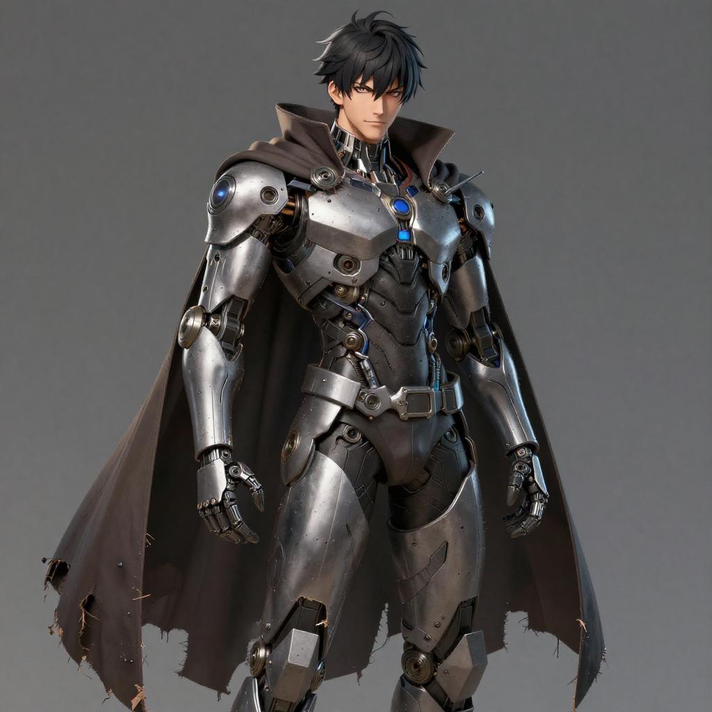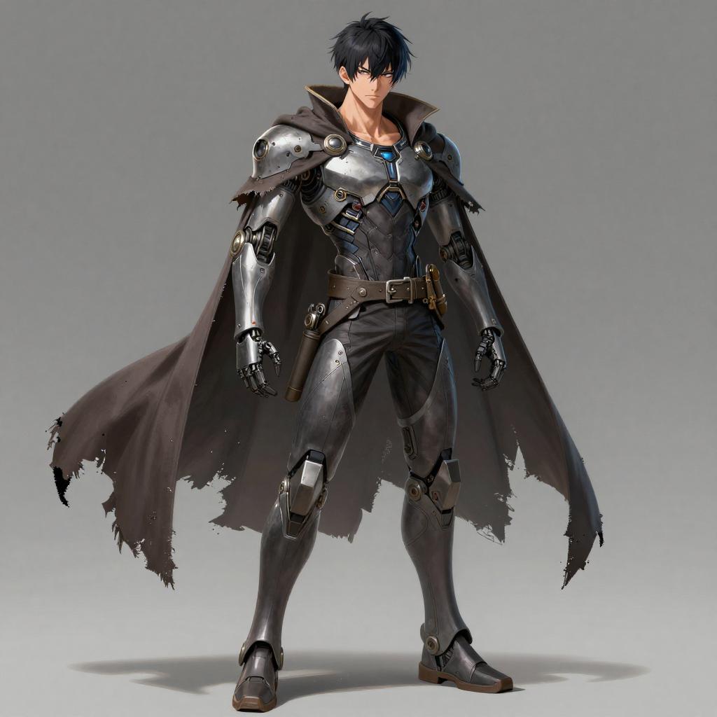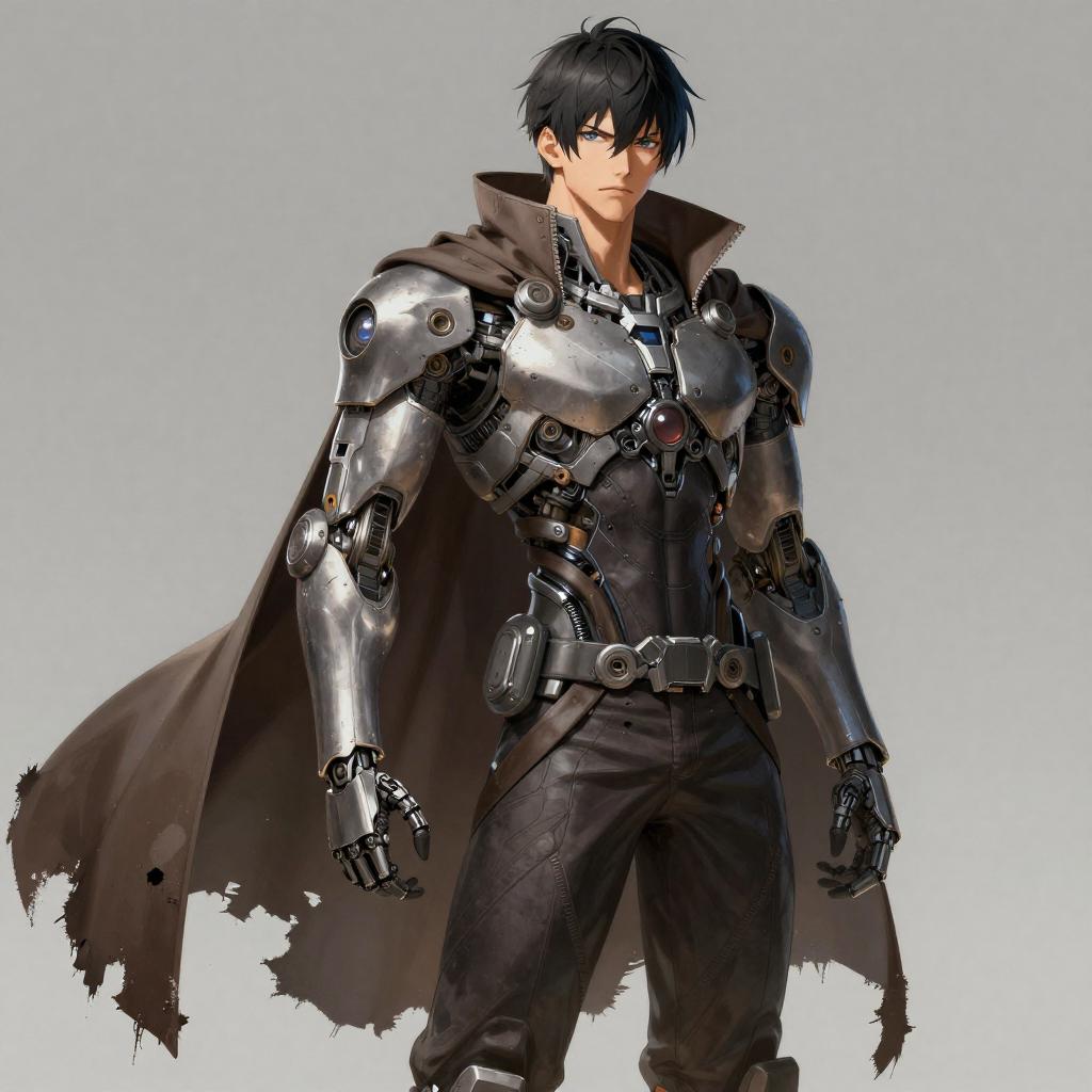 A detailed manga character portrait of a dark haired silver cyborg anime man wearing a tattered brown cape, trending on artstation, digital art, 4 k resolution, detailed, octane render, high quality, sharp focus, hq artwork, insane detail, concept art, character concept, character illustration, full body illustration, cinematic, dramatic lighting