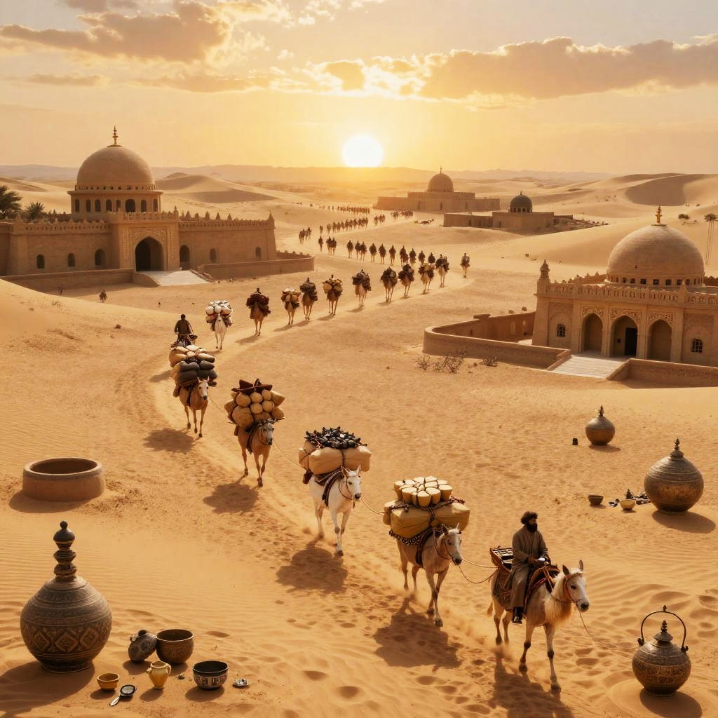 Cultural diffusion image showing ancient trade routes with caravans carrying goods, blending architectural styles and artifacts from various civilizations under a golden sunset