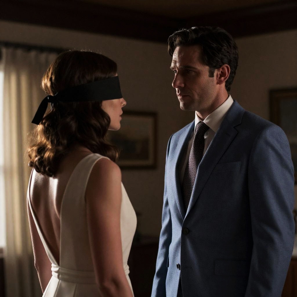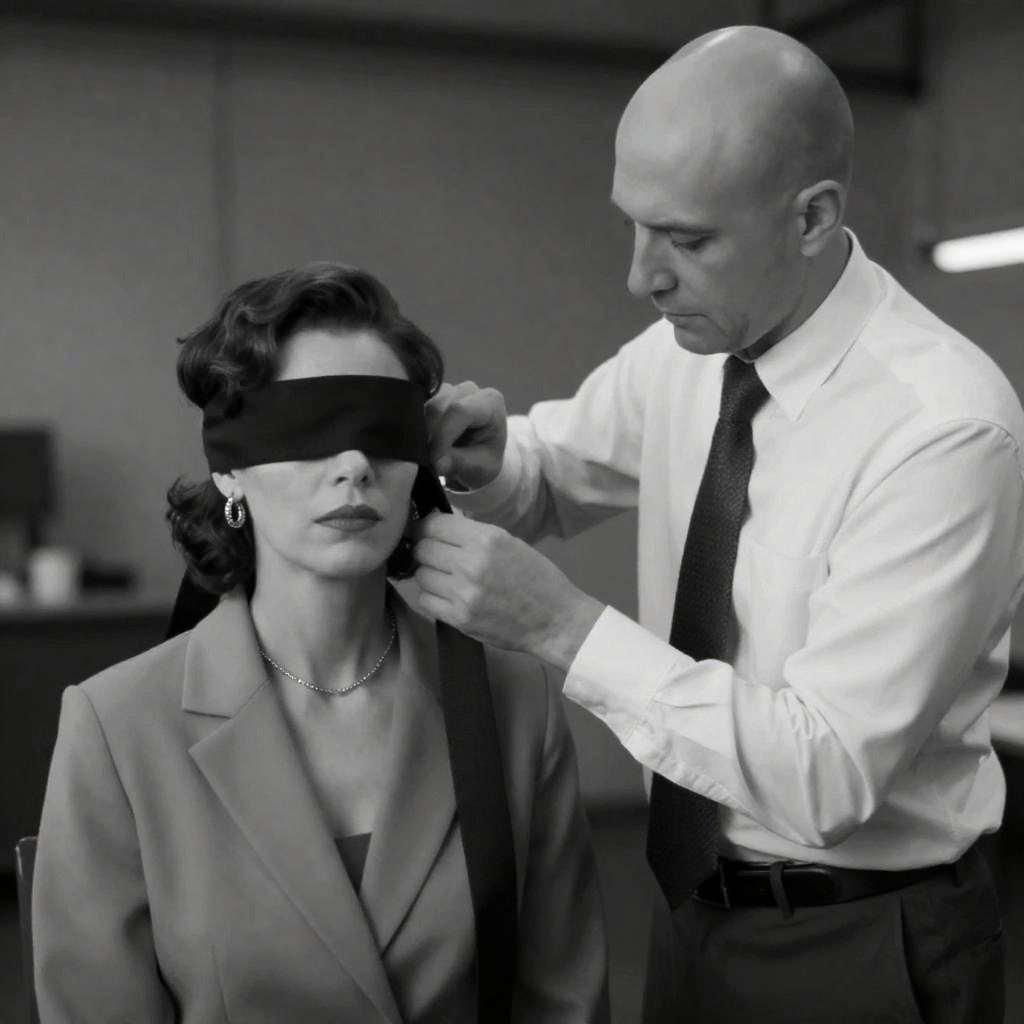 Black-and-white photograph of a man with a bald head, wearing a light shirt and tie, securing a blindfolded woman with short, wavy hair. She wears a blazer, necklace, and large earrings. The man leans forward, hands on straps. Industrial background. Woman's expression is neutral. Man's expression is focused.