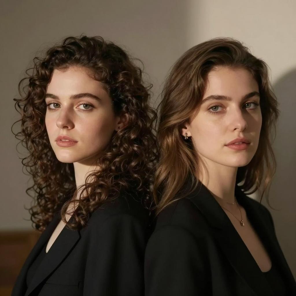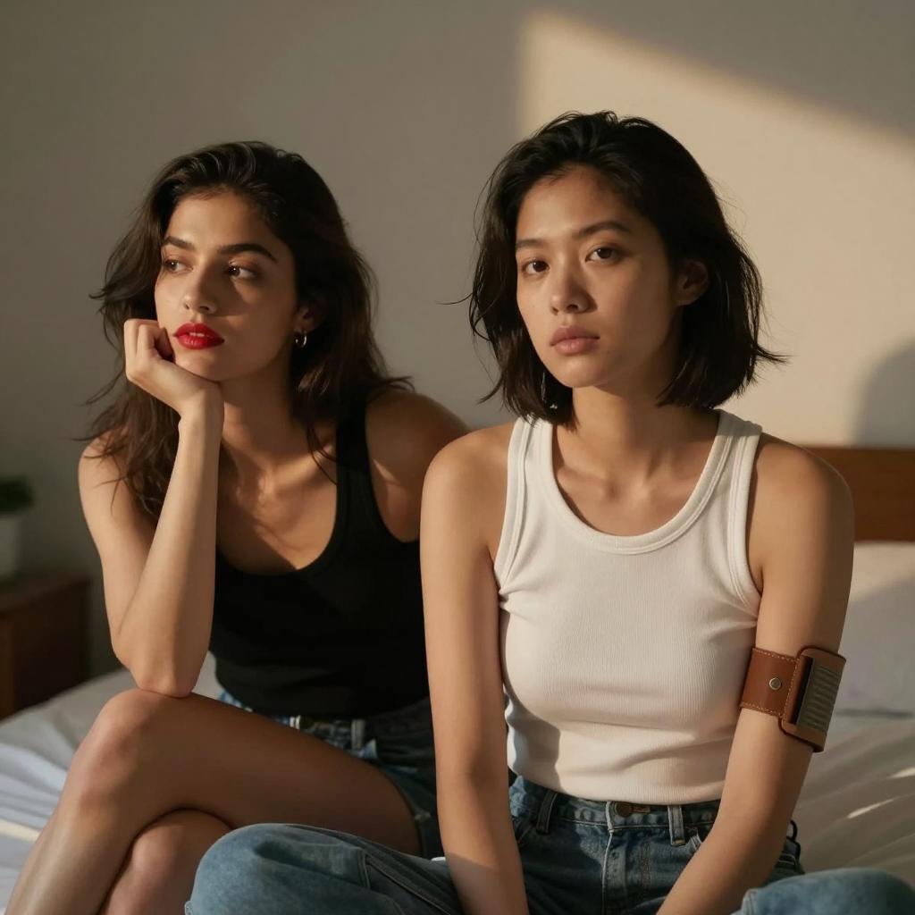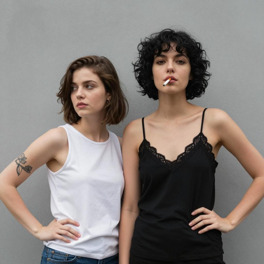 Two women standing against a ured gray wall. The woman on the left has short brown hair, a white sleeveless top, and a tattoo on her right arm. She leans slightly against the other woman. The woman on the right has short black curly hair, wears a black lace-trimmed spaghetti strap top, and has a cigarette in her mouth. Both women have hands on their hips. The woman on the right stands slightly taller. The woman on the left looks to the left, while the woman on the right looks directly at the camera.