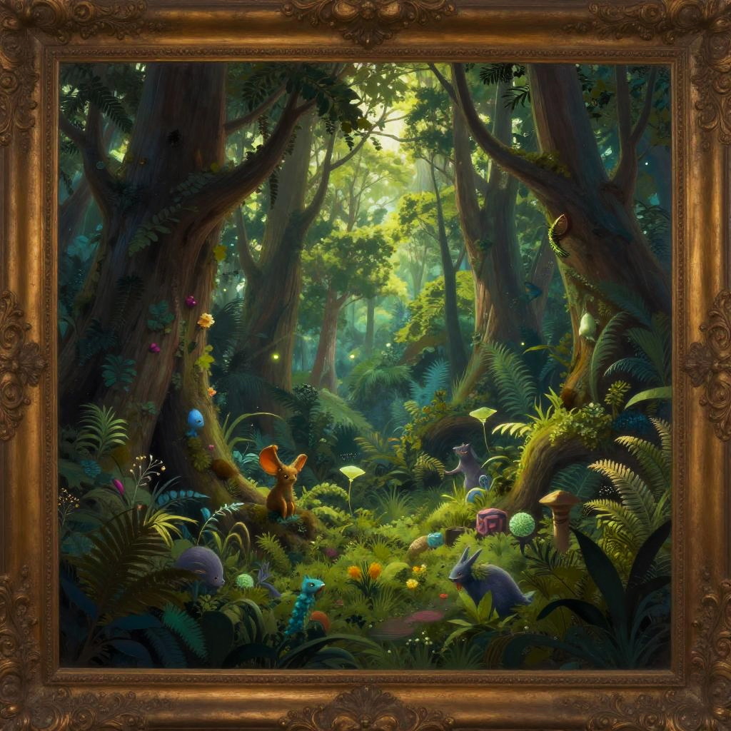 This is a digital painting of a vibrant, enchanted forest in a detailed, fantasy style. The scene is rich with lush greenery, large trees, and a dense undergrowth of ferns and colorful mushrooms. Sunlight filters through the canopy, creating a dappled light effect. Various whimsical creatures, including a small orange bird, a blue and purple lizard, and a tiny, purple, mushroom-like being, are scattered throughout the forest floor. The background features towering trees with thick trunks and a misty atmosphere. The painting is framed in an ornate, gold, baroque-style frame, adding a touch of elegance to the fantastical scene.